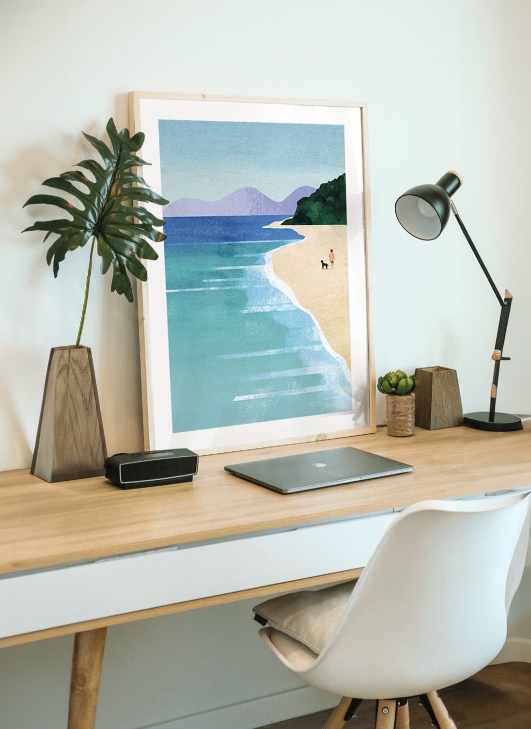 Originally from the Isle of Wight, he blends hand-painted and digital techniques to create textured artworks that evoke calm and escapism.